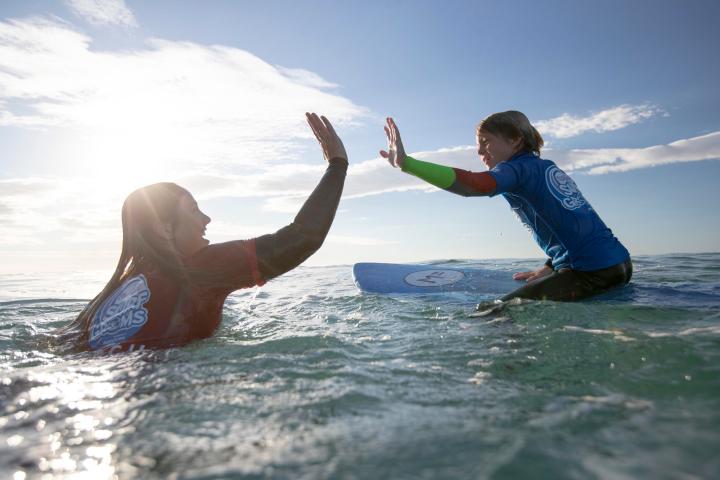 nudie SurfGroms teaches children from 5-12 years old core skills in the ocean across five incremental skill levels, as well as fundamental ocean awareness and beach safety skills such as surf survival and rescue techniques, basic first aid skills, and about varying surf conditions at the beach.